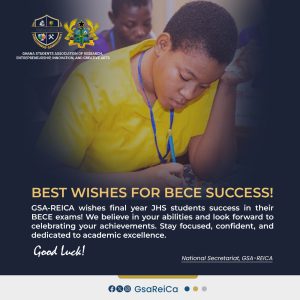As the Ghana Students Association of Research, Entrepreneurship, Innovation, and Creative Arts (GSA-REICA), we are delighted to extend our best wishes to final year Junior High School (JHS) students as they prepare to sit for their Basic Education Certificate Examination (BECE). We take this opportunity to acknowledge the hard work and dedication that these students […]